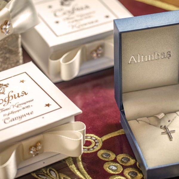 Акцентът е върху голямата и луксозна ръчно изработена кутия от възможно най-устойчивия материал, който не позволява деформация. Размерите на кутията са достатъчни, за да побере всичко нужно за деня на Кръщението (всички дрешки и аксесоари).