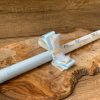 Информация за ритуална свещ с декорация в бяло и бебешко синьо и гравирано име в злато: