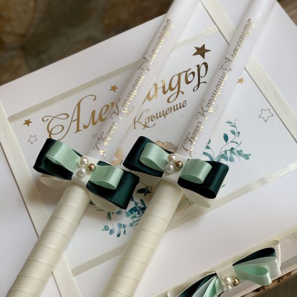 В комплекта е включена декорирана ритуална свещ. Върху нея чрез иновативна технология за метализиране на текста се изписва „Свето Кръщение“ и име на Кръщелника. Надписът е в цвят злато, като може да бъде изработен и в сребро и розово злато.