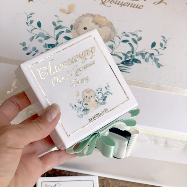 Акцентът е върху голямата и луксозна ръчно изработена кутия от възможно най-устойчивия материал, който не позволява деформация. Размерите на кутията са достатъчни, за да побере всичко нужно за деня на Кръщението (всички дрешки и аксесоари).