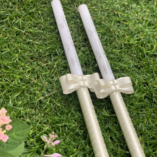 В представения комплект са включени две ритуални свещи. Върху тях чрез иновативна технология за метализиране на текста е изписан надпис „Свето Кръщение“ и името на детето. Надписът е в цвят сребро, като може да бъде изработен и в злато и розово злато. При избор на друг цвят за металния акцент, можем да променим и цветовете на останалите детайли в комплекта, така че всички те да бъдат в унисон.