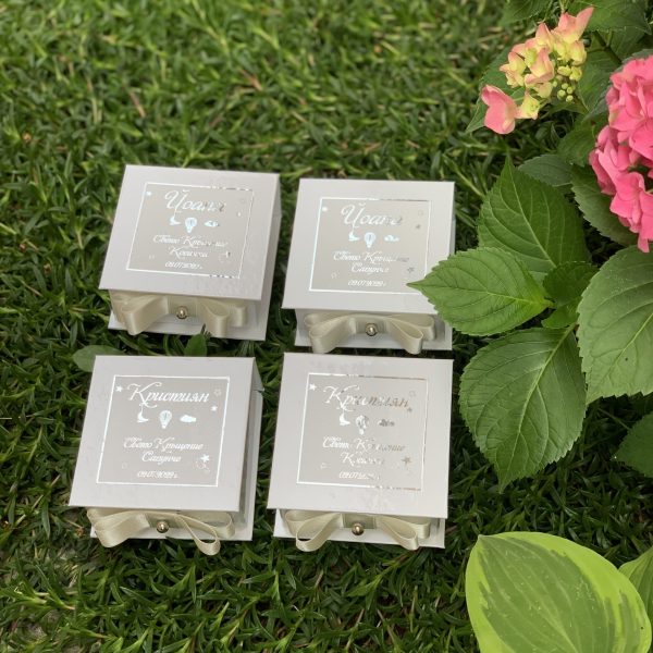 В нашите комплекти ще откриете всичко нужно за ритуала на Кръщението. Кутията в комплекта е ръчно изработена, а върху нея са изписани имената на кръщелниците, датата на събитието, както и надпис „Свето Кръщение“. Декорирана е с нежен дизайн в сребърно.