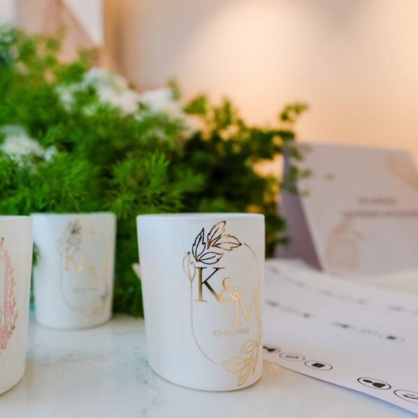 Луксозни свещи, персонализиран подарък за гости в бяло с инициали в златно, розово злато или сребро.